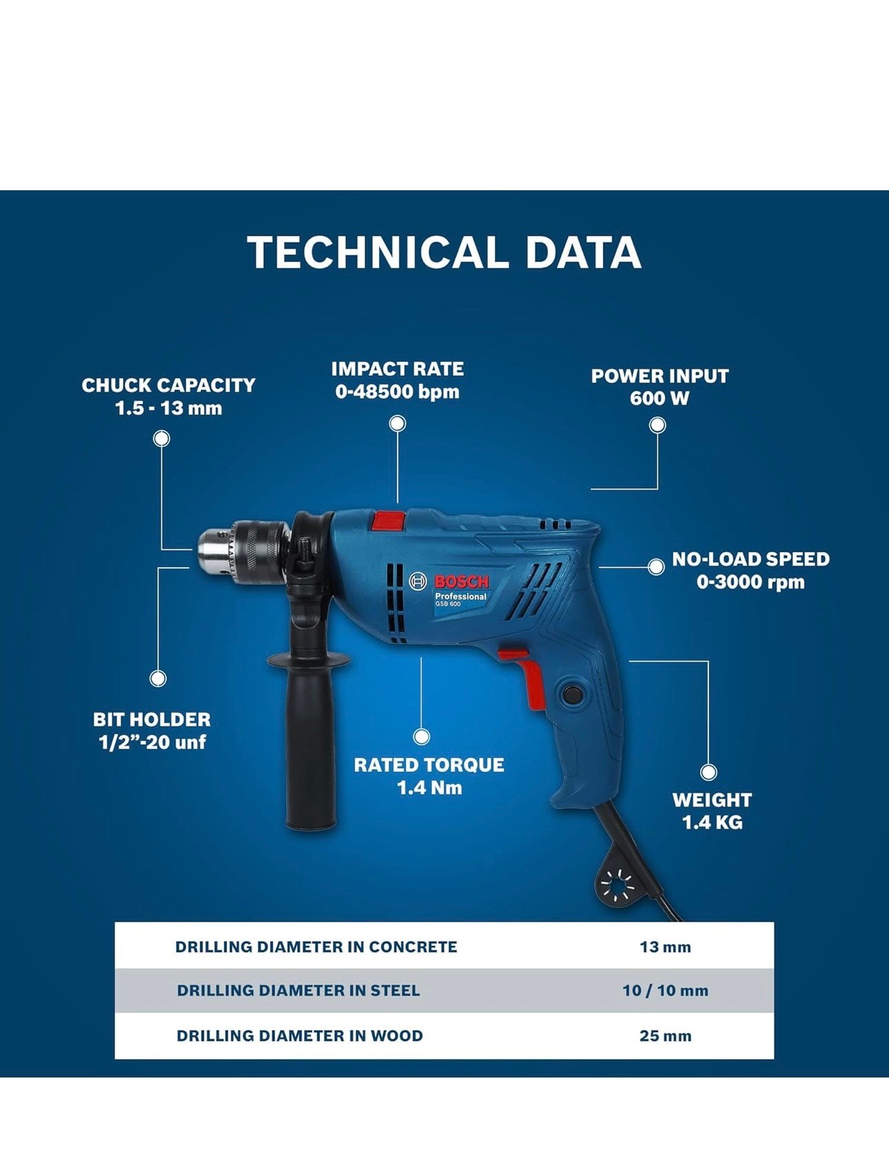 - Powerful Tool: The BOSCH GSB 600 Corded Electric Impact Drill is a robust and long-lasting drill machine powered by a 600 W motor. It is capable of handling demanding tasks and is designed to endure with its high-quality construction. Additionally, the new carbon brush incorporated into the drill contributes to its longevity.