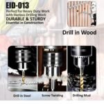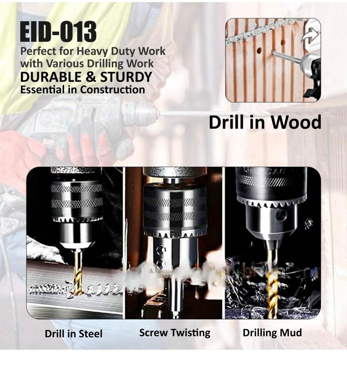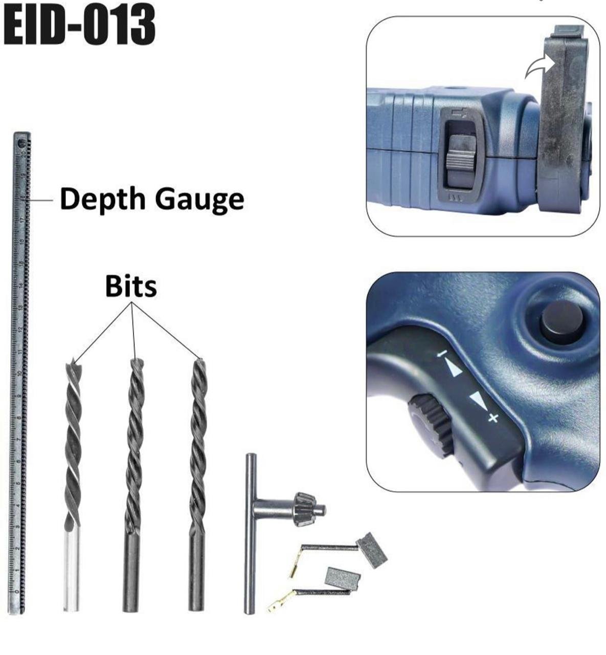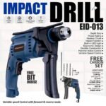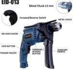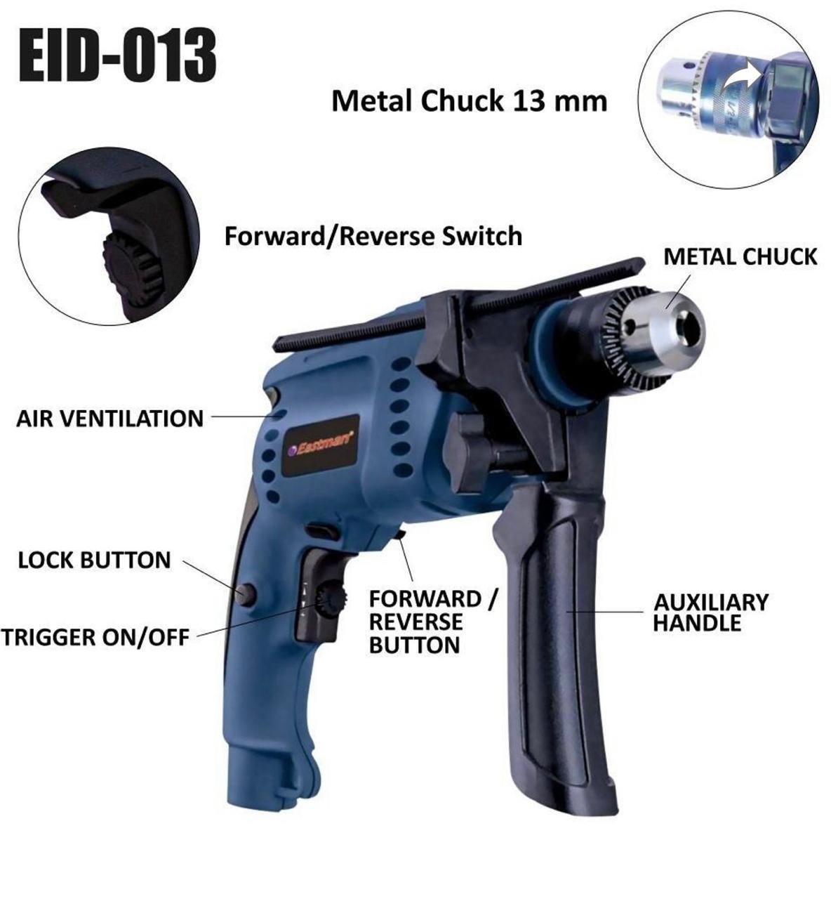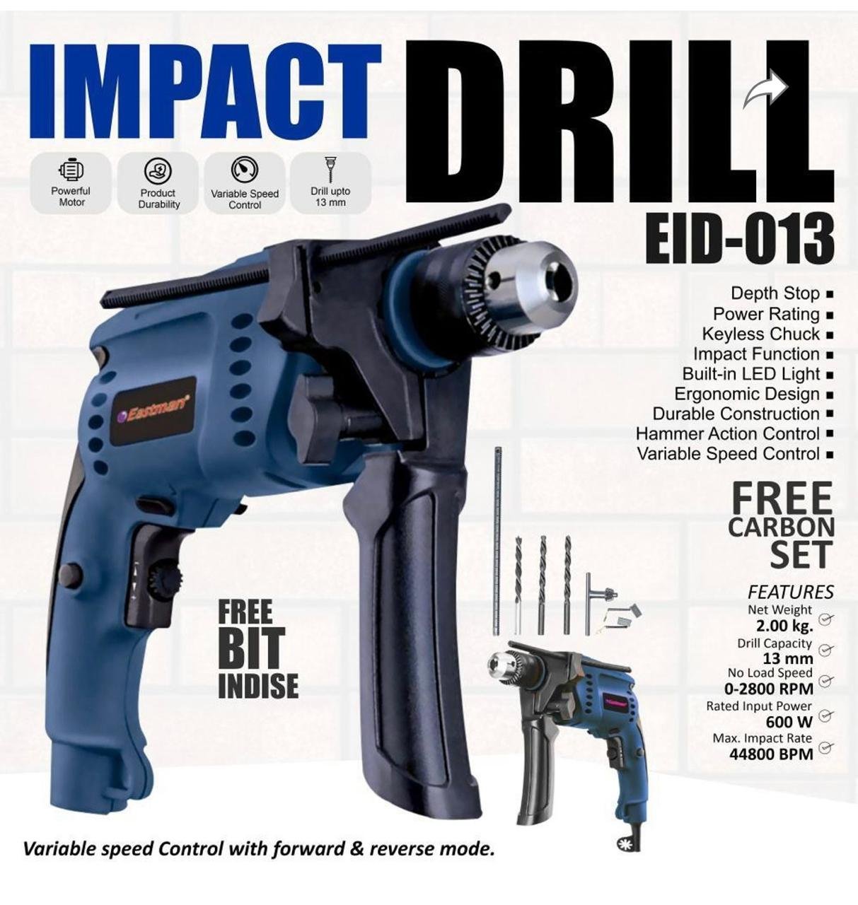 The Eastman JRSDrive Impact Drill EID-013 is designed for both home and professional use. Equipped with a 600W motor, it offers a no-load speed of 0–2800 RPM and an impact rate of 44,800 BPM. Its 13mm chuck capacity allows for versatile drilling in wood, steel, and masonry. Features include variable speed control, forward and reverse modes, and an ergonomic pistol grip for comfortable handling.