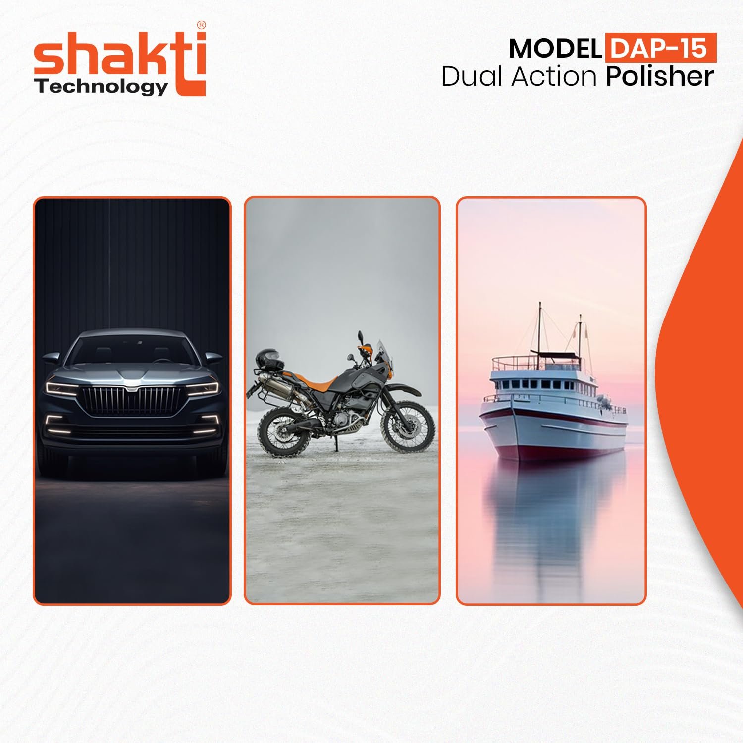 Shakti Technology DAP Dual Action Car Polisher designed for car detailing and paint correction. Random orbital polishing reduces swirl marks and paint damage. 1000W motor ensures stable speed operation for polishing, waxing and finishing tasks.