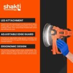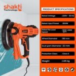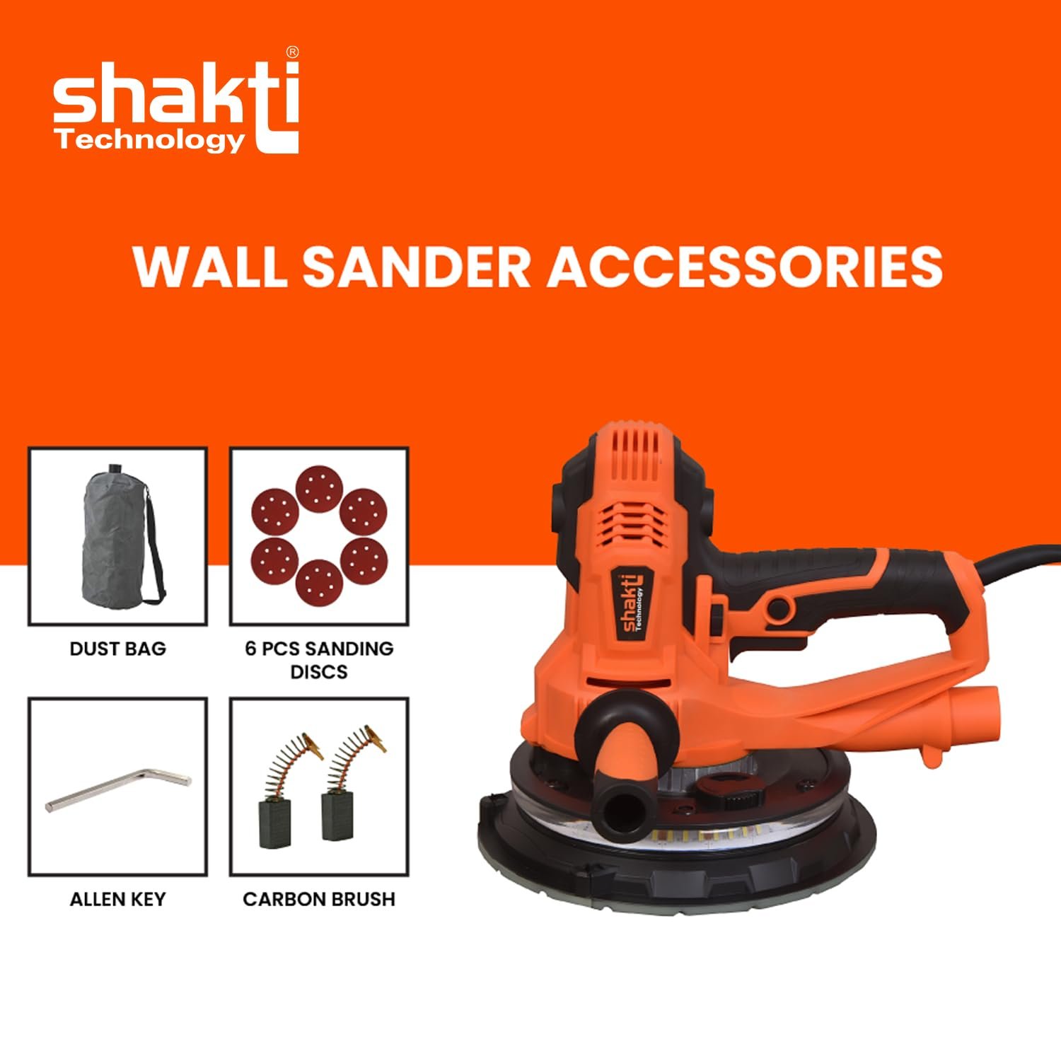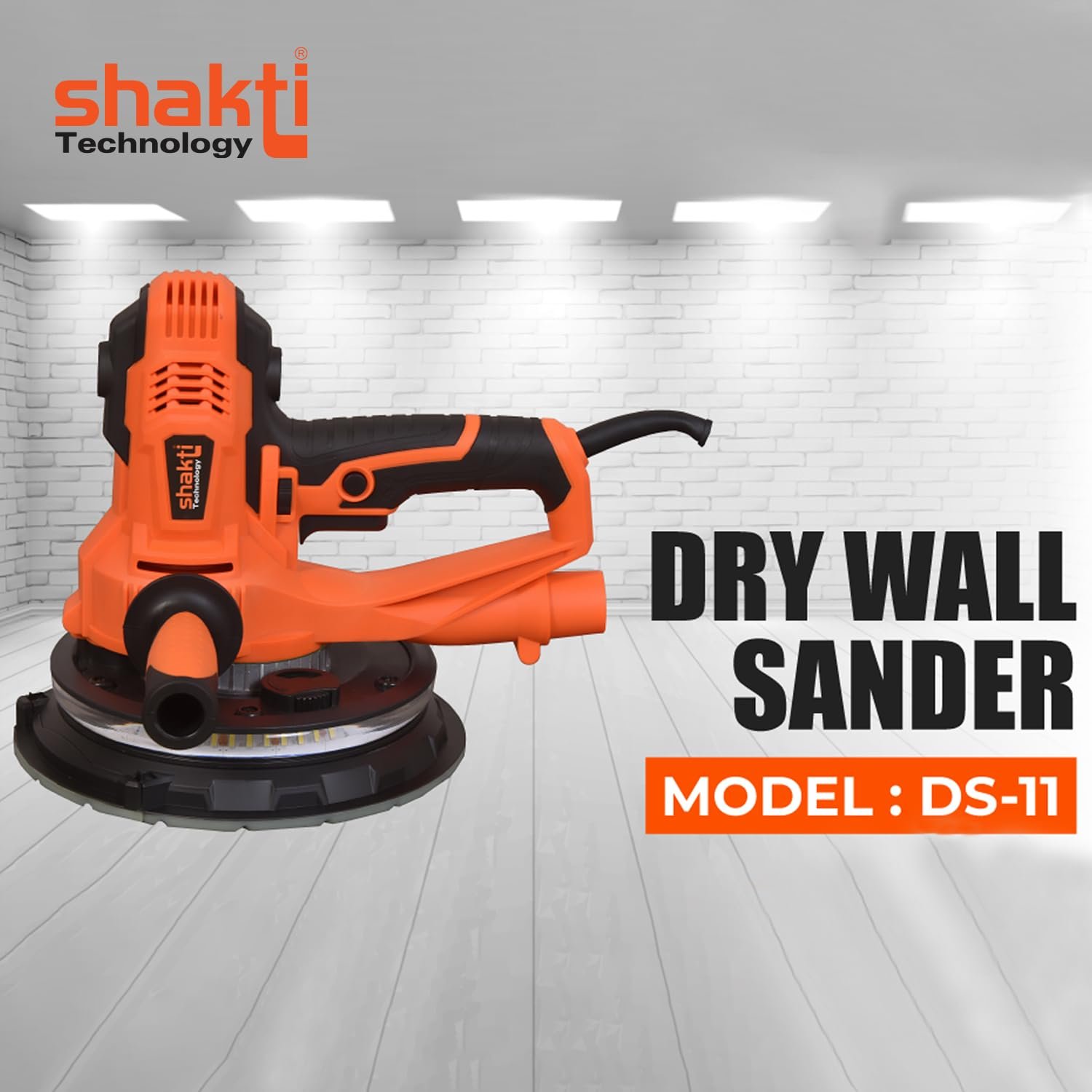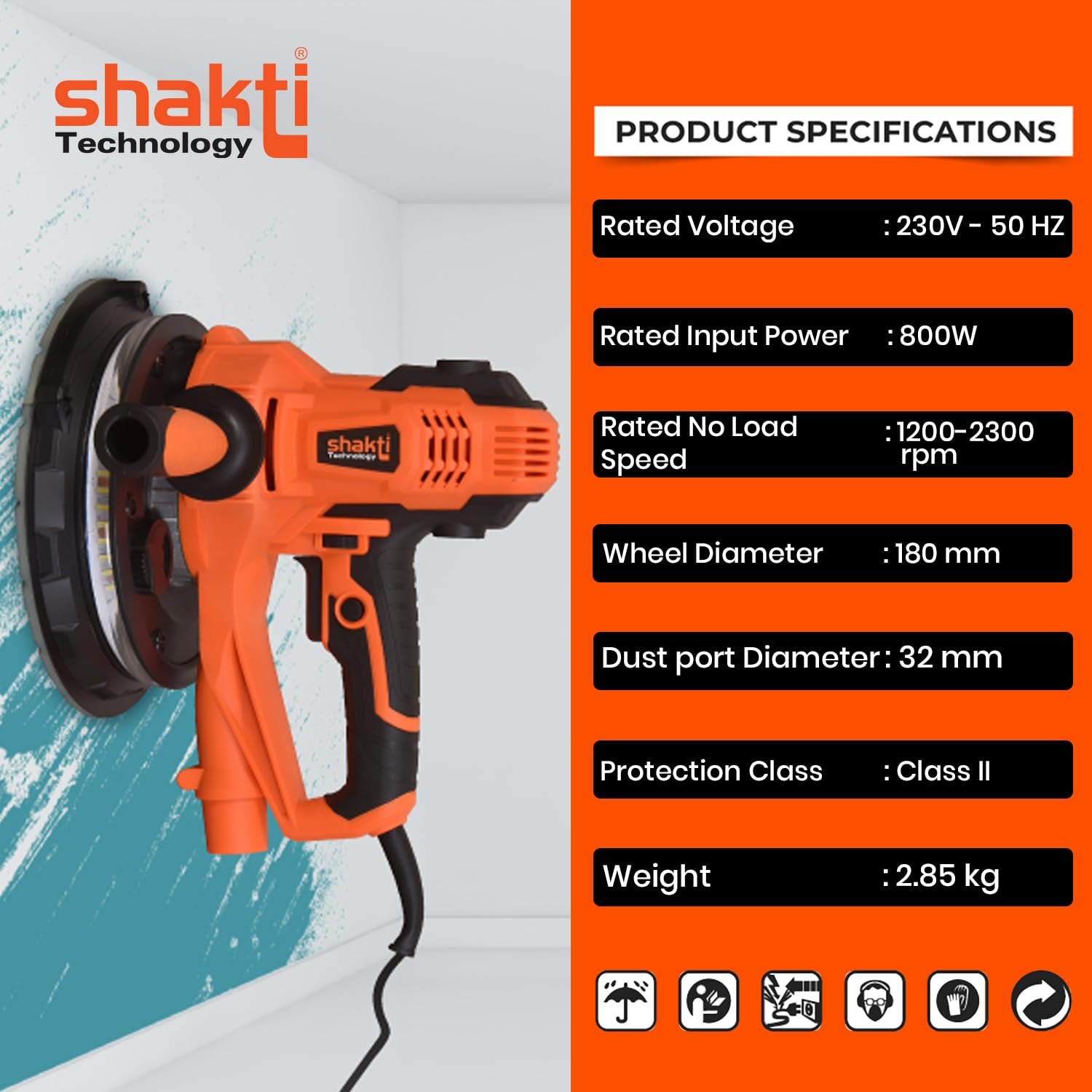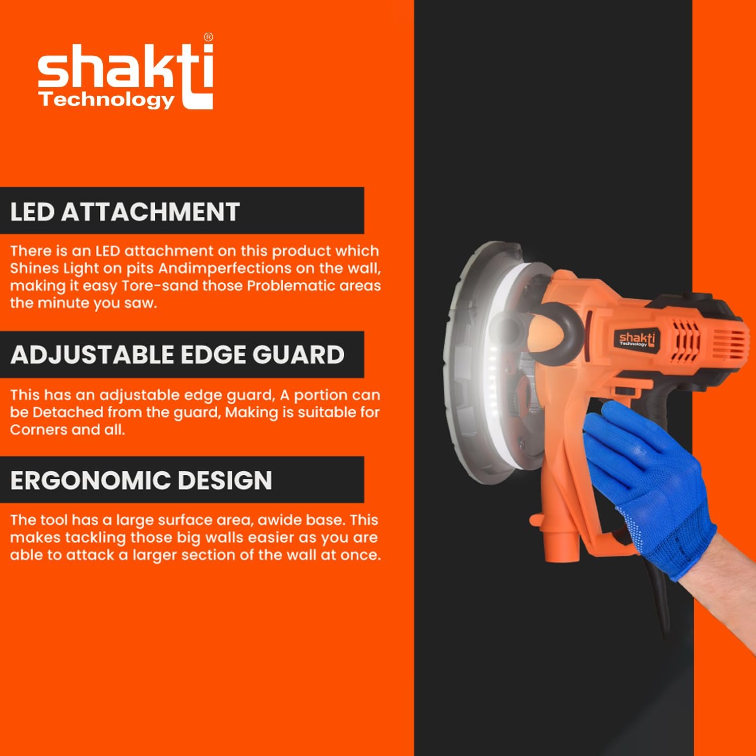 Shakti Technology Dry Wall Sander with vacuum dust collection system. 800W motor delivers approx 2300 RPM sanding speed. Designed for wall finishing, putty sanding and surface preparation. Includes dust bag and LED working light.
