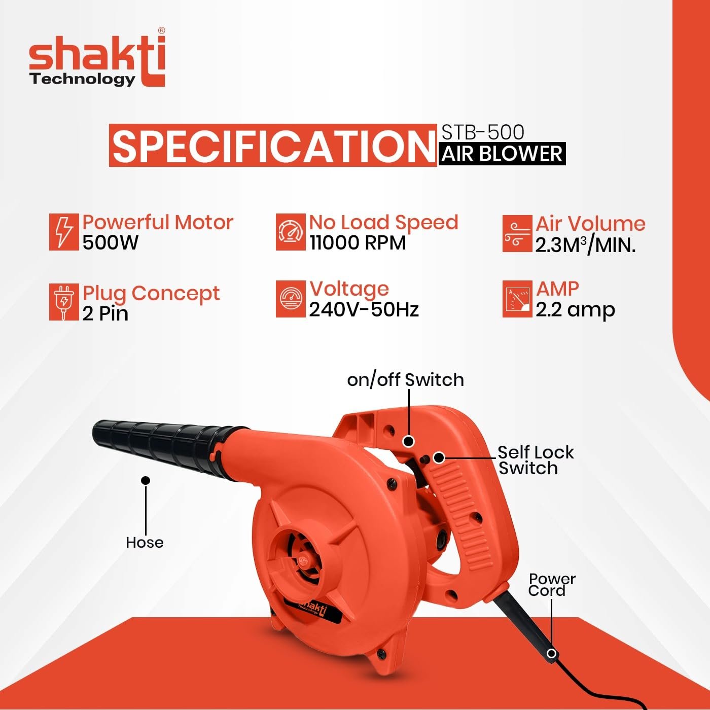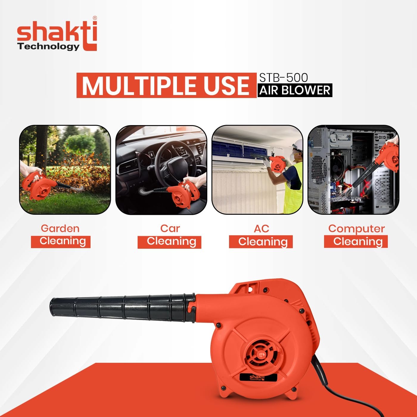 Shakti Technology STB-500 Electric Air Blower is a compact 500W cleaning tool suitable for home, garage and workshop dust cleaning. Provides high speed airflow suitable for electronics, CPU cleaning, car interiors and small machinery maintenance. Ergonomic lightweight design allows extended use without fatigue. Designed for reliable performance and daily cleaning tasks.